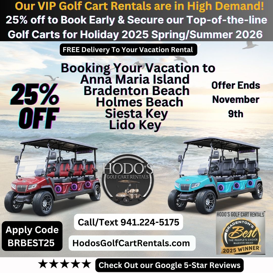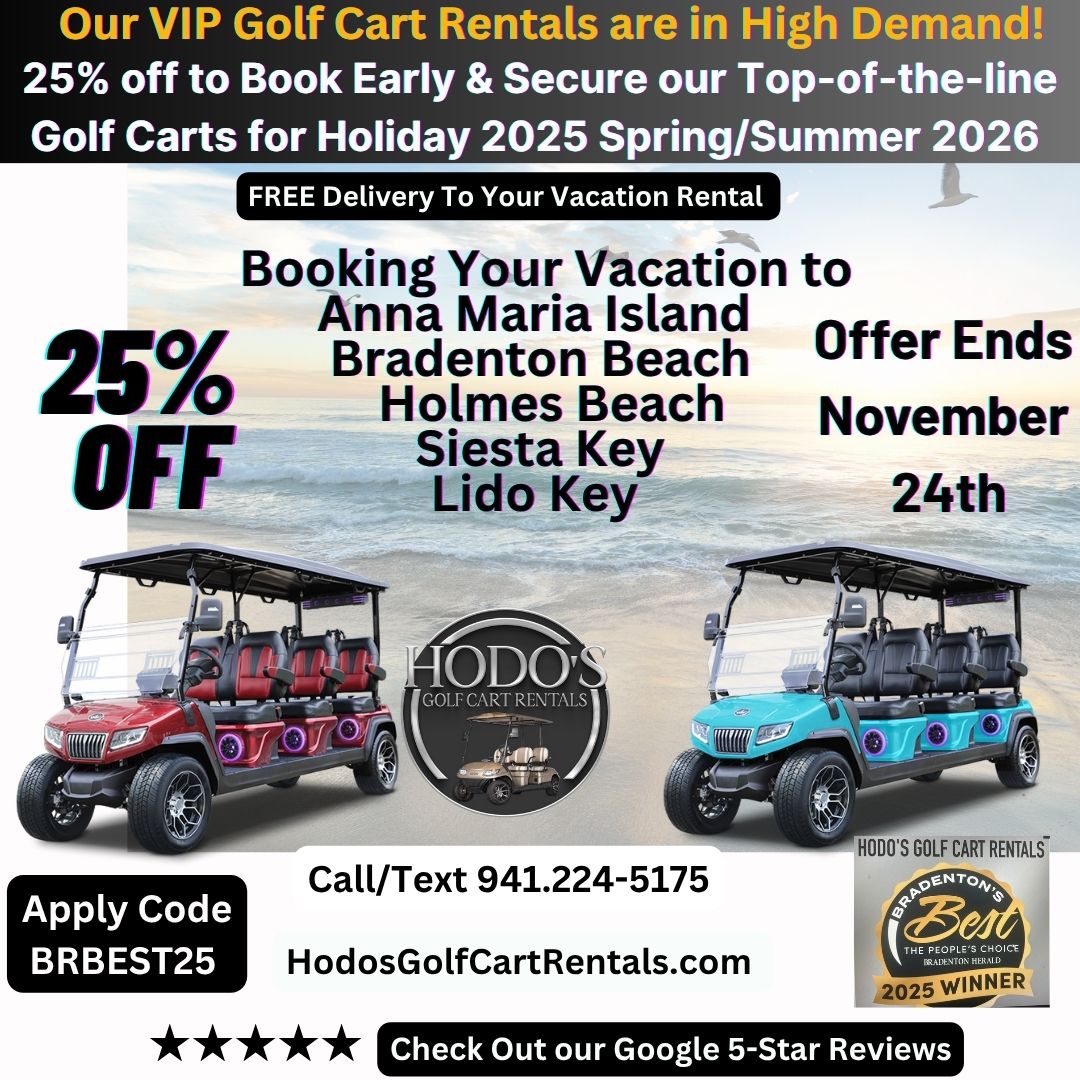 Most allow it, but please ask the vacation property manager about Anna Maria Island, Holmes Beach, Bradenton Beach, & Siesta Key to ensure their rules and regulations. Lakewood Ranch, Bradenton, & Sarasota Communities, please verify with your HOA if they permit street-legal golf cart rentals.