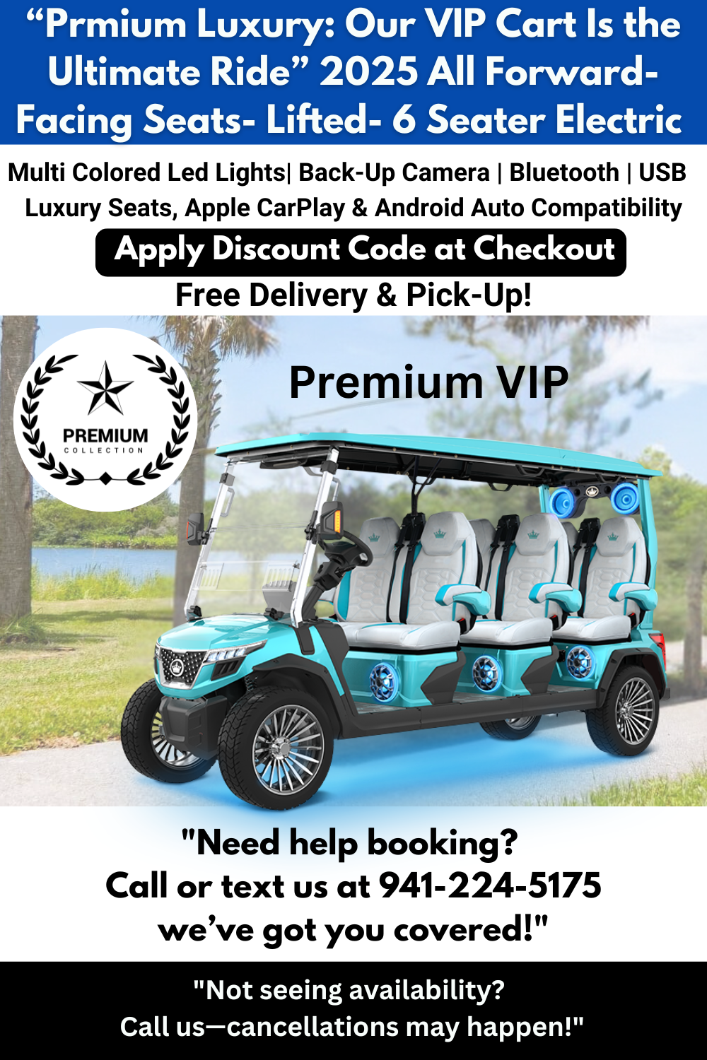 Turn every ride into an adventure with the Evolution D-MAX GT 6 Seater. Designed for both comfort and performance, this premium golf cart is built to impress on Anna Maria Island, Siesta Key, and beyond.