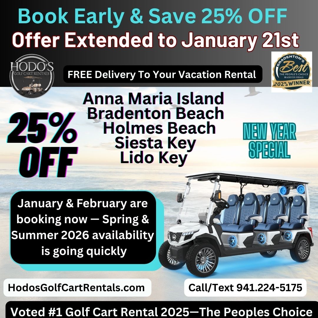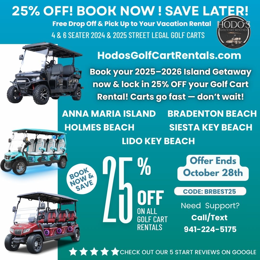 Call or text 941-224-5175 to reserve your golf cart today! Book here